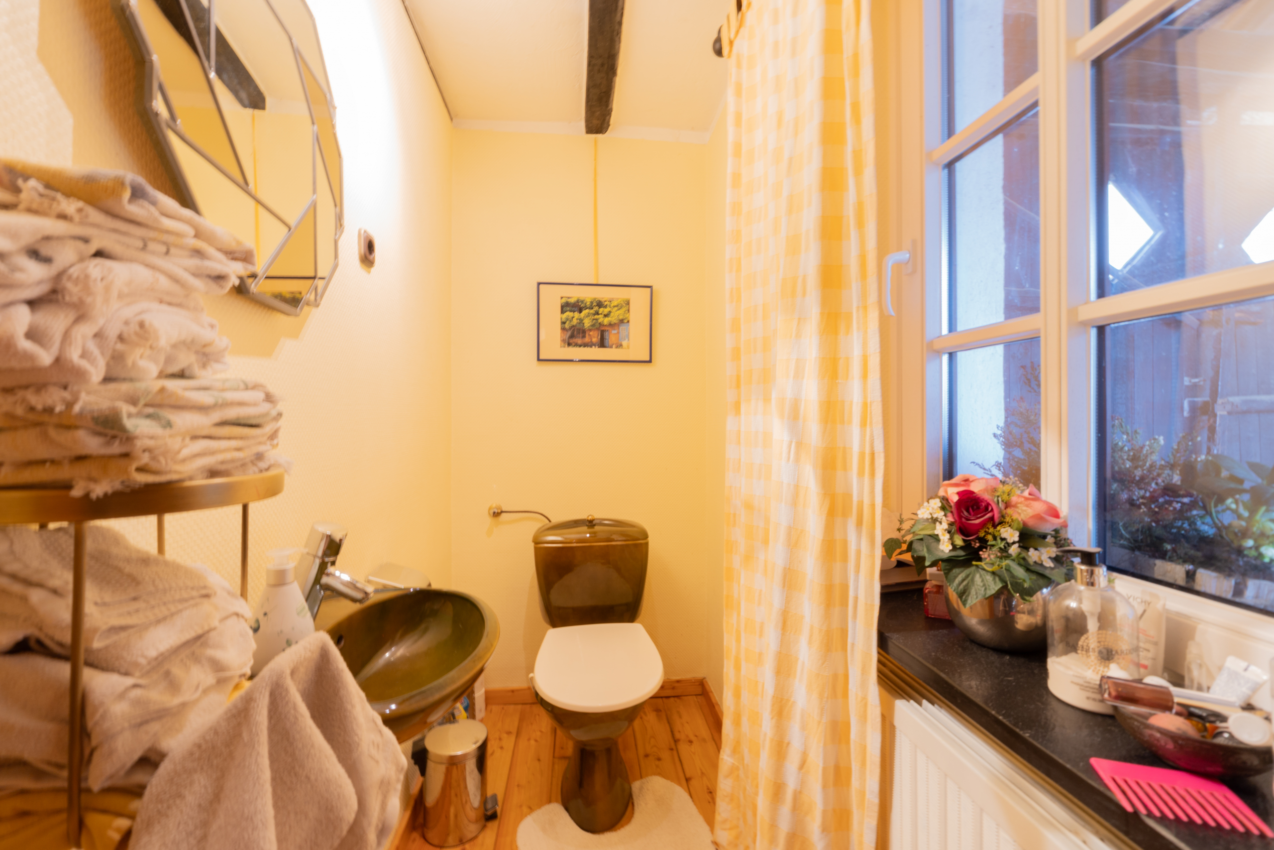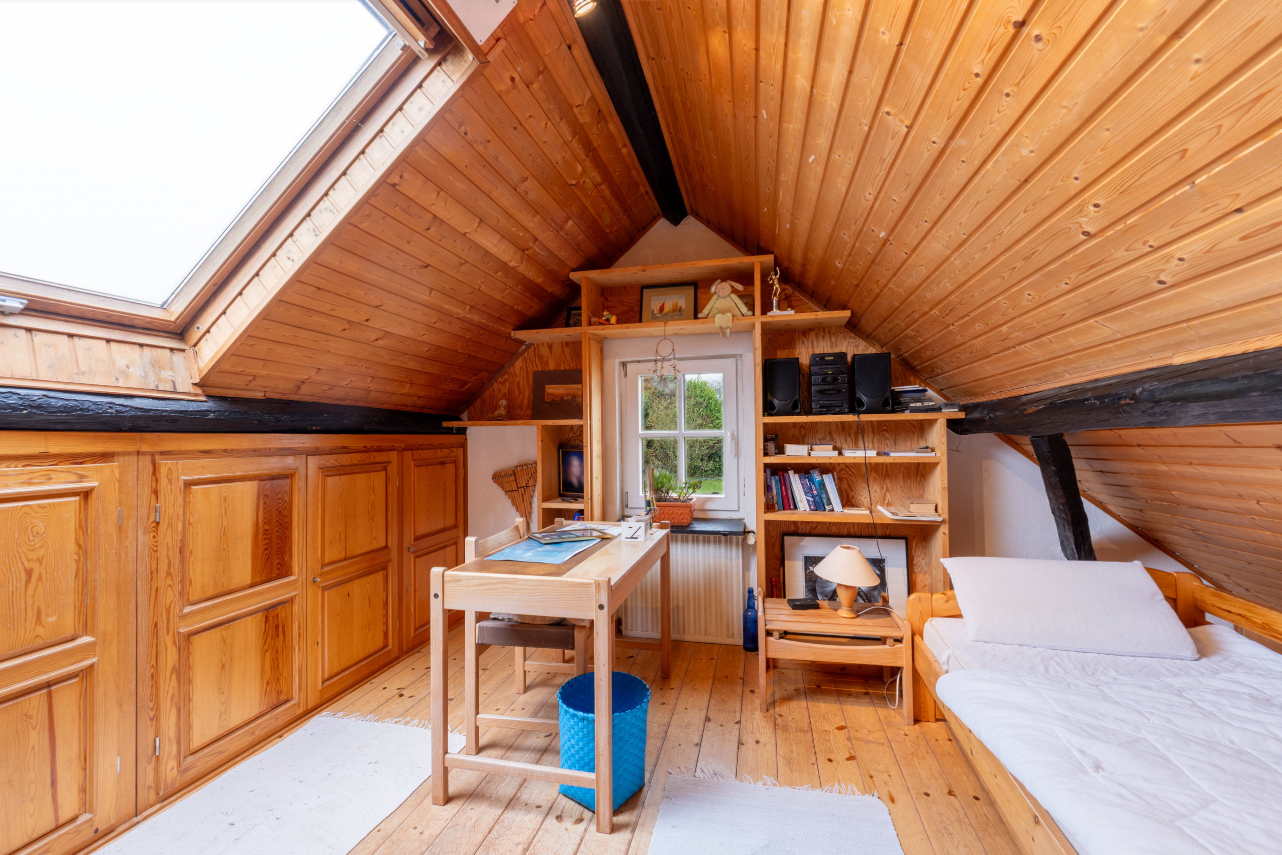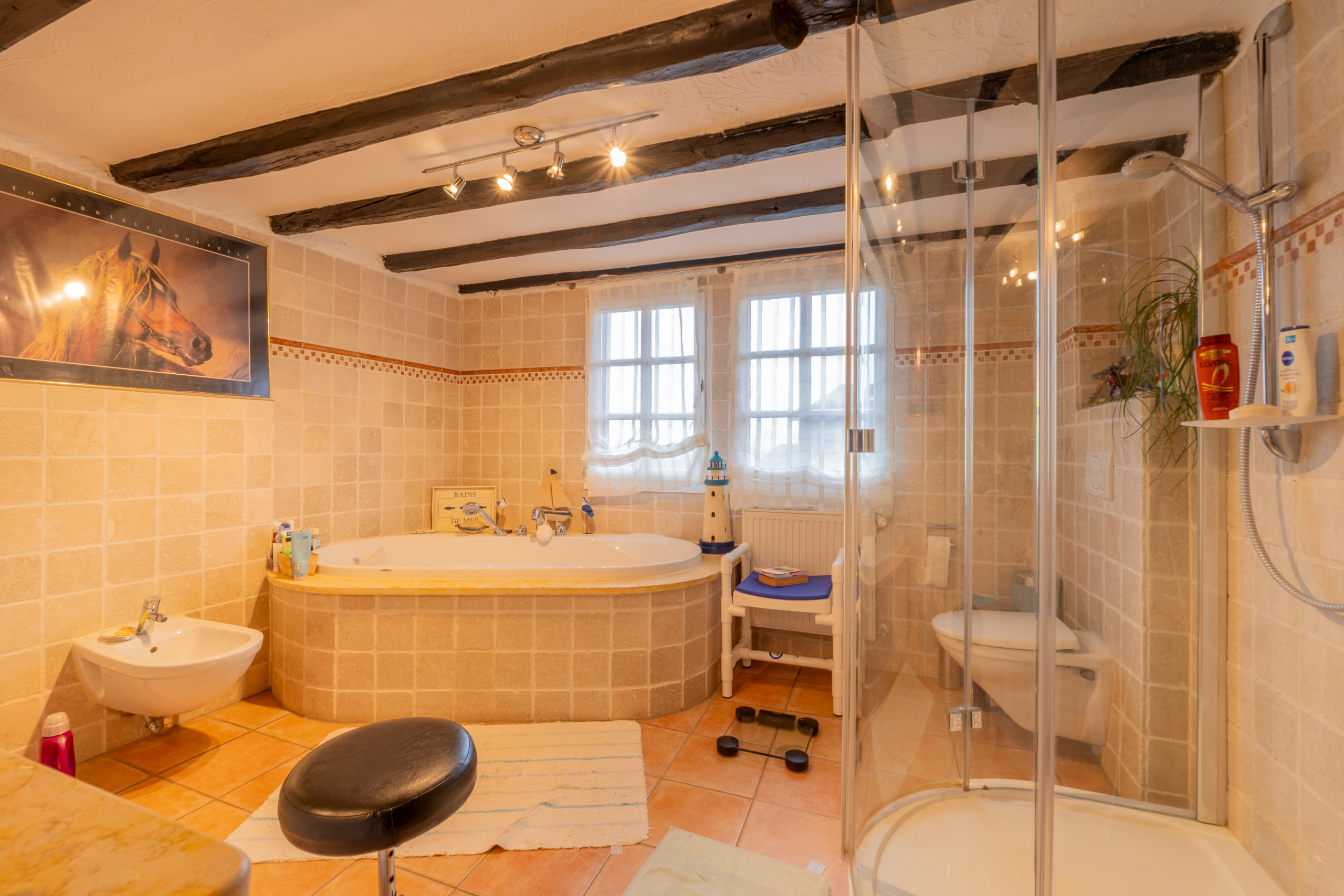 Das Dachgeschoss beherbergt ein zusätzliches Badezimmer mit Dusche und Dachfenster, ideal für Gäste oder die Ferienwohnung. Die Ferienwohnung im Scheunentrakt ist komplett ausgestattet und bietet etwa 50 Quadratmeter eigene Wohnfläche. Sie eignet sich perfekt für Vermietung, Mehrgenerationenwohnen oder als Atelier.