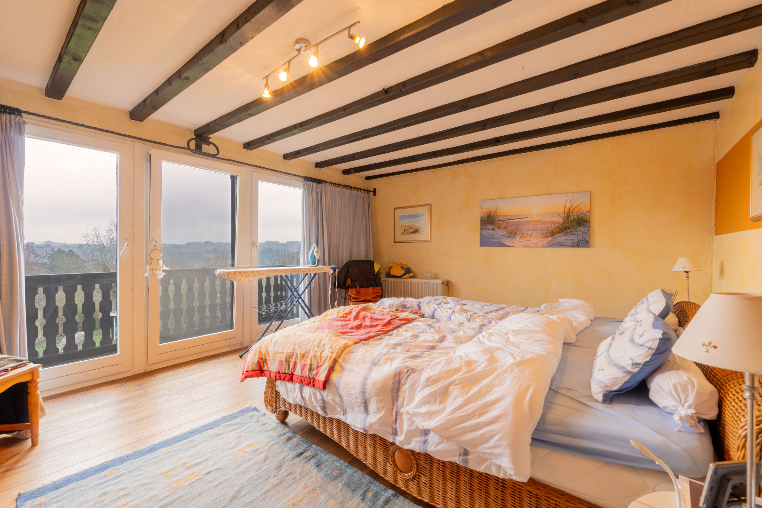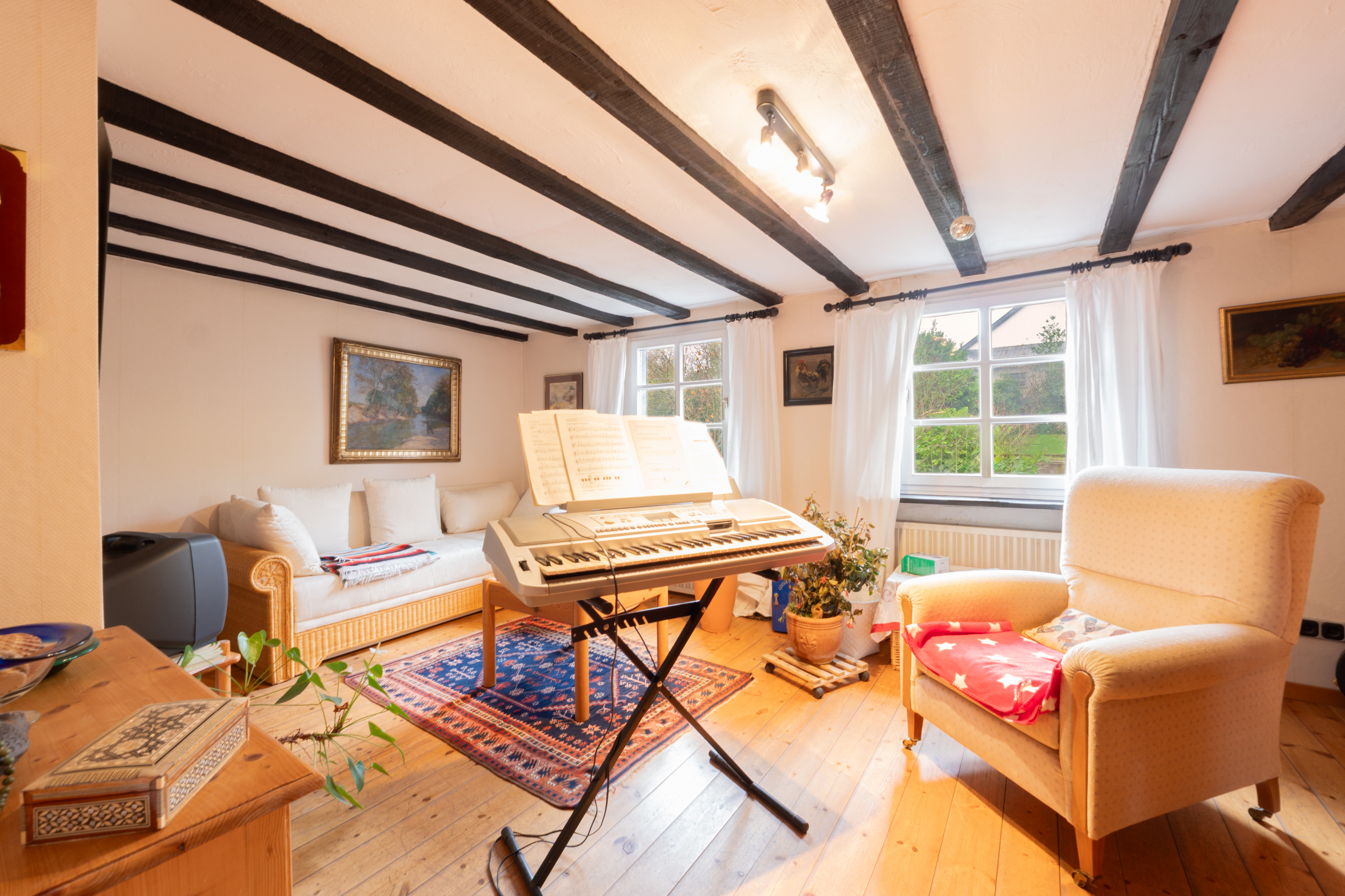 Die großzügige Wohnküche mit maßangefertigter Vollholzküche bietet viel Stauraum und überzeugt durch ihren rustikalen Landhauscharakter. Im ersten Obergeschoss erwarten Sie mehrere Wohn und Schlafräume, darunter ein großes Schlafzimmer mit bodentiefen Fenstern und herrlichem Ausblick über die Landschaft. Weitere Räume eignen sich ideal als Arbeitszimmer, Musikzimmer, Gästezimmer oder private Rückzugsorte.