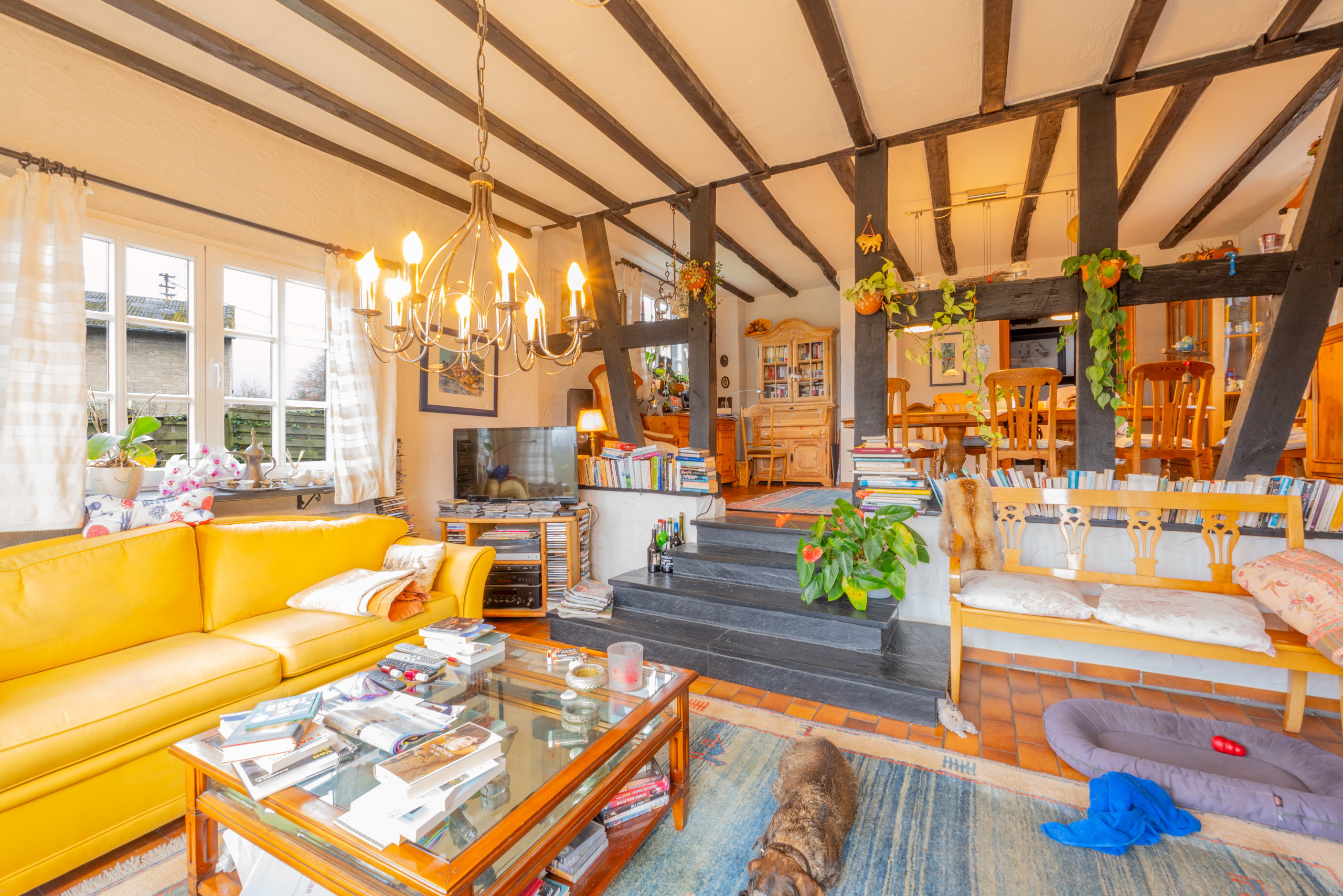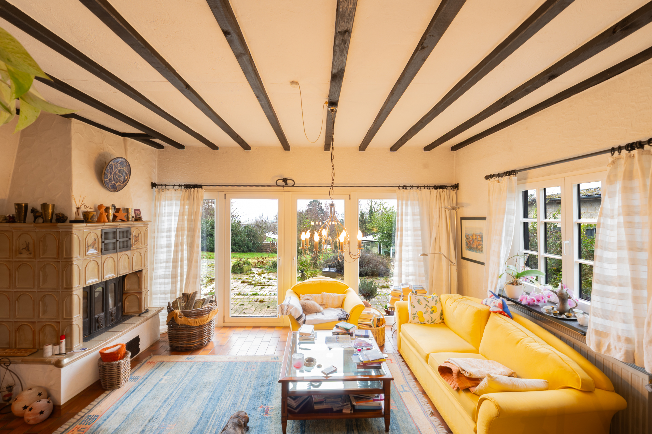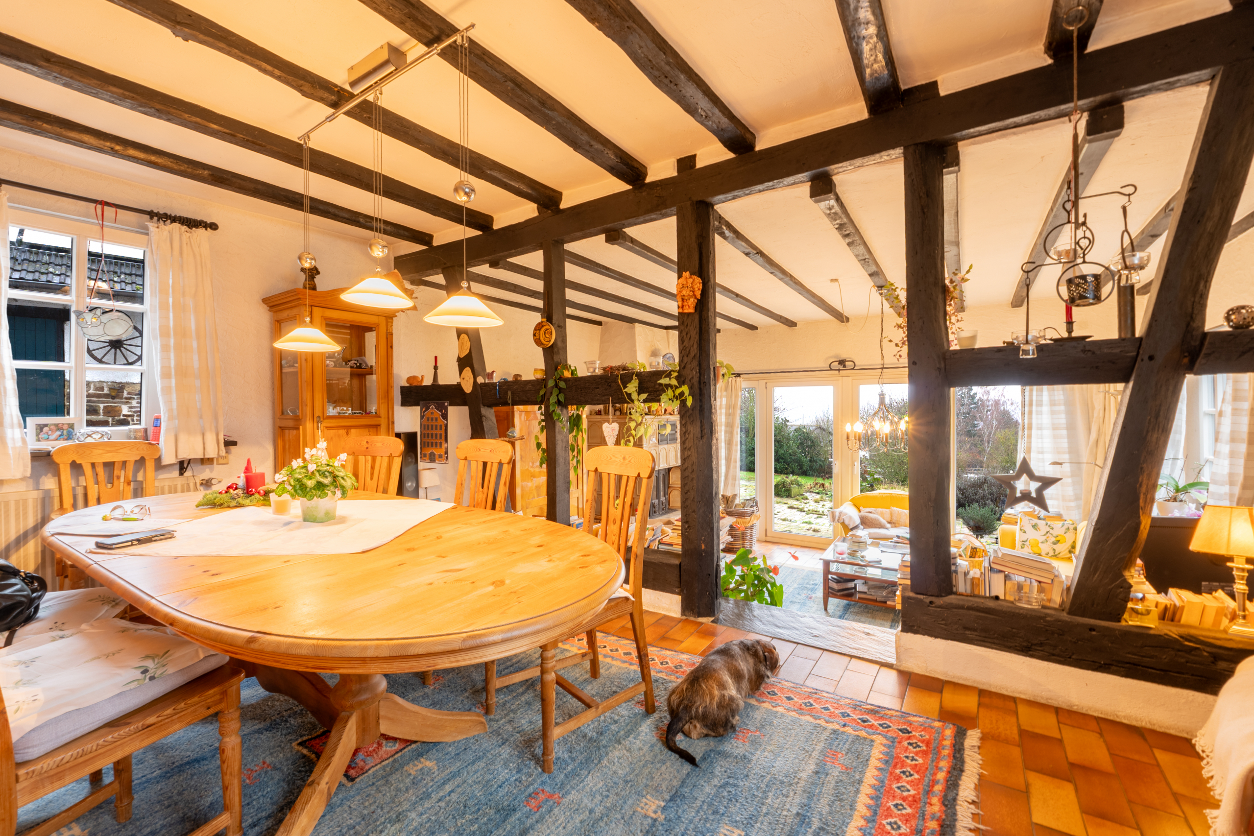 Bereits beim Betreten empfängt Sie ein wunderbar gemütliches Ambiente mit sichtbaren Holzbalken, warmem Holz, handwerklichen Details und einer offenen Treppenanlage. Das Wohn Esszimmer erstreckt sich über zwei Ebenen und schafft durch große Fensterflächen eine helle und freundliche Atmosphäre. Der massive Kachelofen liefert zusätzlich wohlige Wärme und macht den Raum zu einem echten Mittelpunkt des Hauses.
